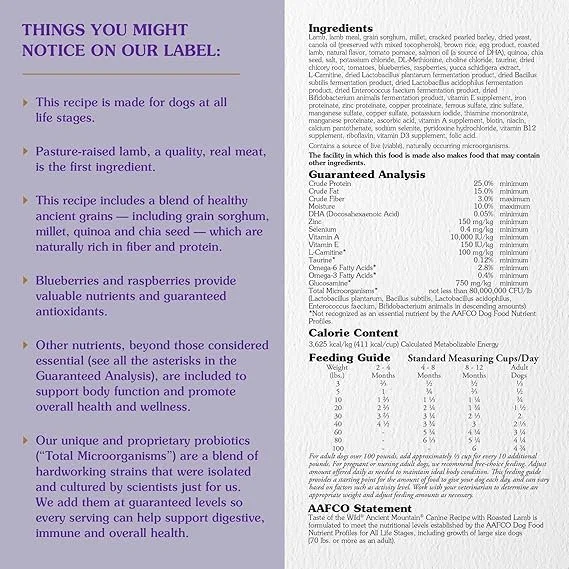 Taste of the Wild with Ancient Grains Ancient Mountain with ROASTED LAMB dry dog food; REAL MEAT is the #1 ingredient; 25% protein to help support bones, joints and LEAN, STRONG MUSCLES