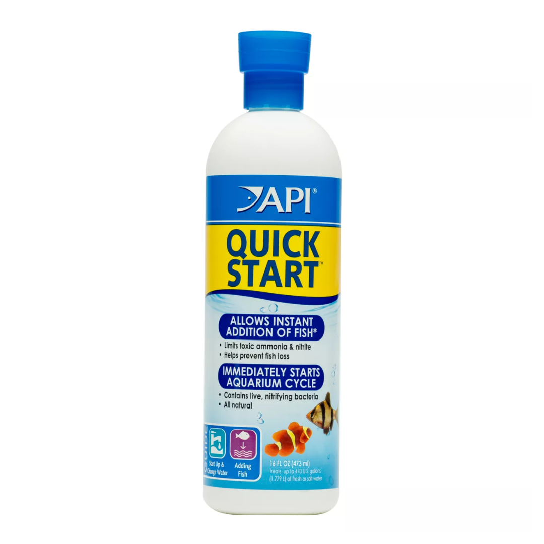 API Quick Start freshwater and Saltwater Aquarium Nitrifying Bacteria in a 16-oz bottle is perfect for use when starting a new aquarium. This product reduces harmful compounds, preventing fish loss.